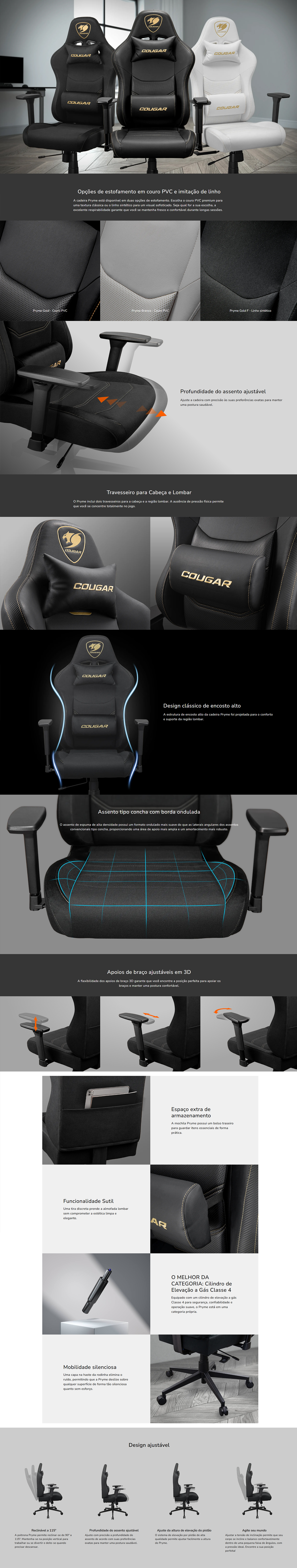 Cadeira Gamer Cougar Pryme Gold F, Reclinável, 3D, Cinza, Preta, CGR-PRM-GLB