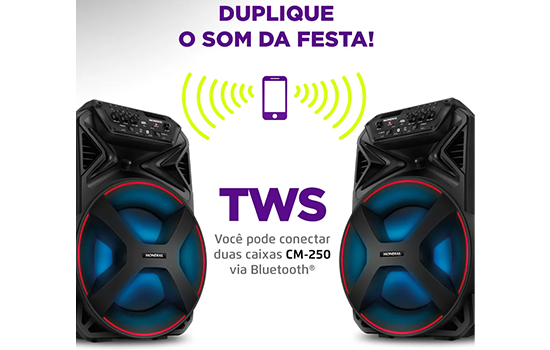 A Caixa Amplificada Connect Party Plus CM-250 é o que falta para turbinar sua celebração! Com design compacto e bateria interna recarregável, você pode levar sua festa para qualquer lugar.