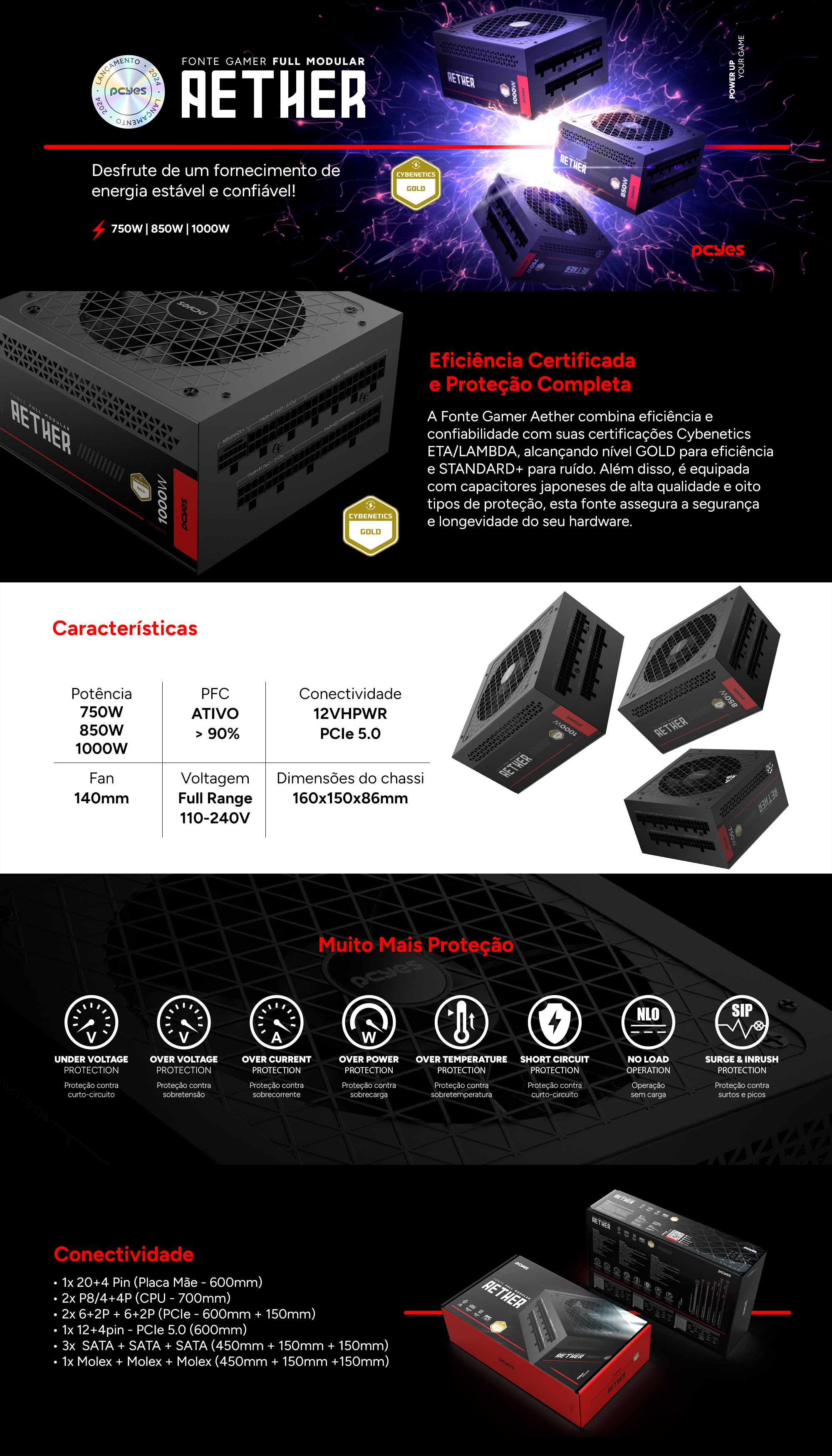 Fonte PCYes Aether, 1000W, Cybenetics Gold, PFC Ativo, PCIe 5.0, ATX 3.1, Full Modular, Preto, 1000WFMG