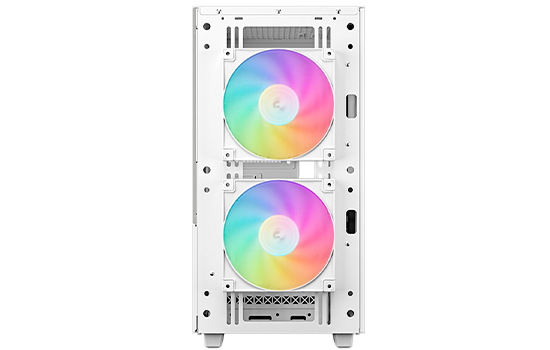 Duas ventoinhas ARGB de 140 mm habilitadas para PWM luminosas vêm pré-instaladas na parte frontal do CH360 WH e introduzem uma quantidade abundante de ar fresco no chassi. Essas ventoinhas são montadas fora do compartimento principal para fornecer espaço extra para GPUs modernas, mantendo um espaço menor. Uma ventoinha ARGB de 120 mm está incluída na parte traseira do gabinete para ajudar a exaurir o calor interno do gabinete.