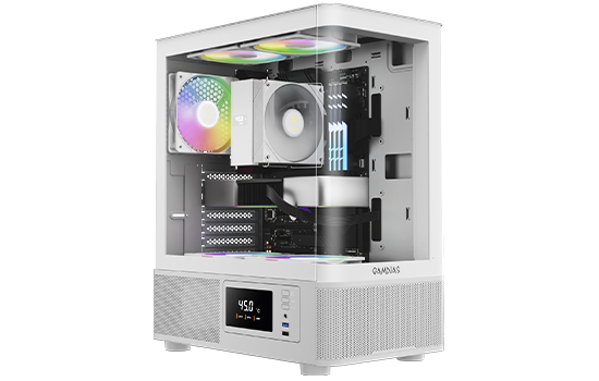 A série ATLAS E2 CG está disponível nas edições preta e branca. O gabinete possui saídas de ar perfuradas com três ventoinhas ARGB integradas para fluxo de ar ideal e um monitor personalizável para informações do sistema em tempo real. Aproveite o benefício do design curvo de vidro temperado sem emendas, proporcionando visuais impressionantes da sua montagem de todos os ângulos.