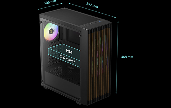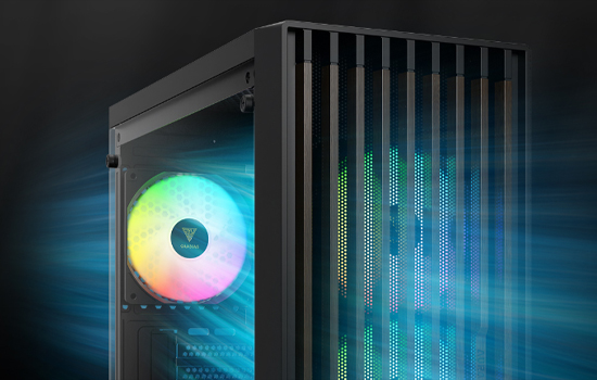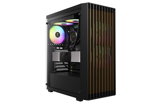 O AURA GC4 ARGB é um gabinete torre média acessível com um layout elegante e eficiente. O painel frontal é feito de madeira de nogueira genuína com malha perfurada para uma estética premium com fluxo de ar ideal, integrado com 3 ventoinhas ARGB integradas e um painel panorâmico de vidro temperado para destacar seu sistema.