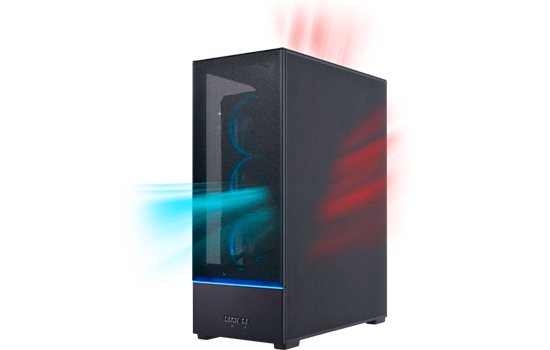 As entradas da GPU direcionam o ar frio através do painel de malha frontal e expele o calor pela lateral com três ventoinhas de 120 mm pré-instaladas, melhorando significativamente a dissipação térmica.