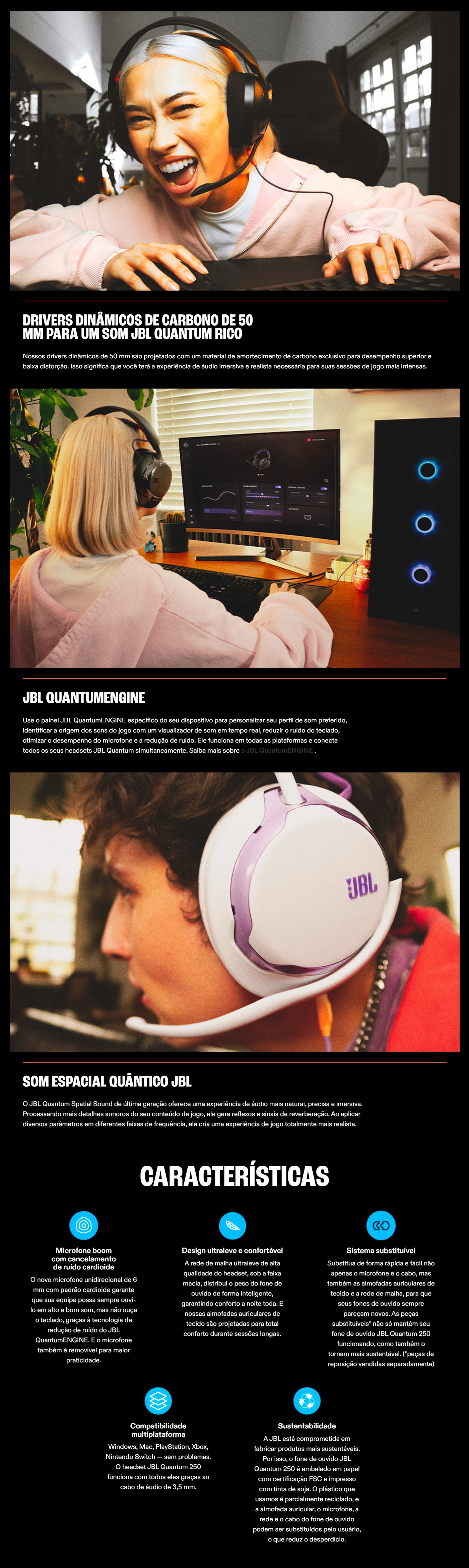 Headset Gamer JBL Quantum 250 White, 3.5mm, Drivers de 50mm, Microfone Destacável, Branco, JBLQTUM250WHT