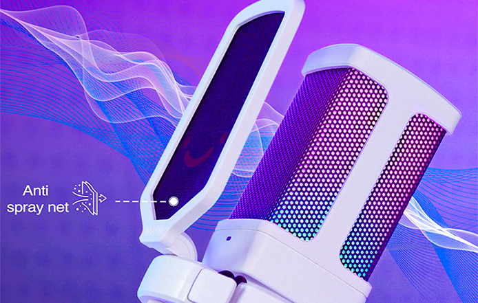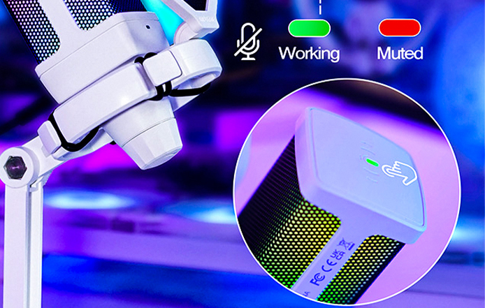 Use a funcionalidade de toque-para-mudo conveniente para evitar um acidente de áudio, juntamente com a ajuda do indicador de status de mic rgb. Se a luz estiver acesa, o microfone está ativo, se a luz estiver desligada, o microfone é silenciado, basta tocar na parte superior do microfone.