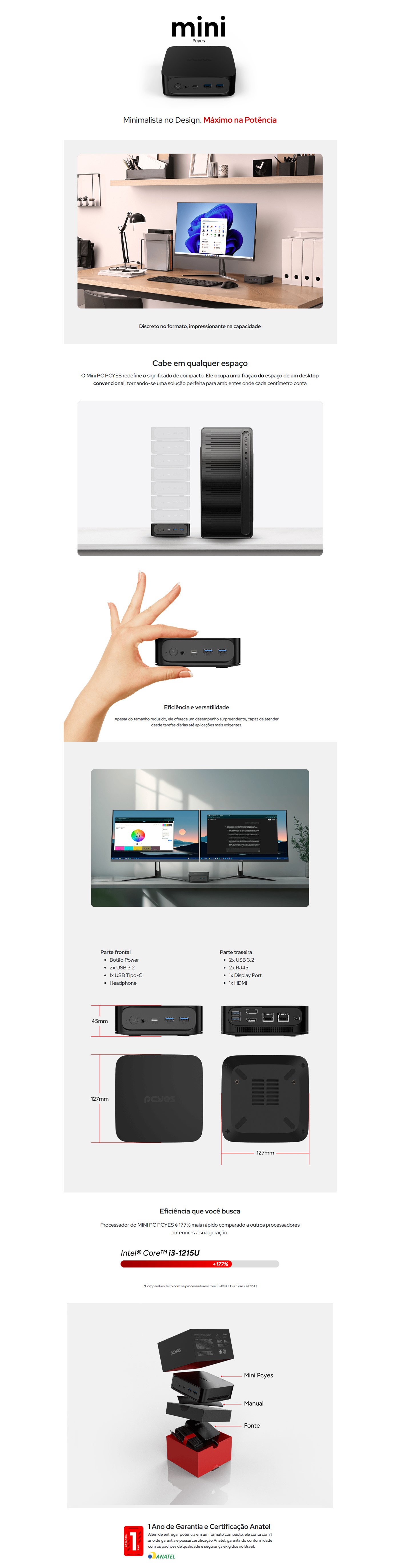 Mini Computador PCYes B300 Intel Core i3-1215U, 8GB DDR4, SSD 256GB, Wi-Fi, Windows, Preto, B50064-294050