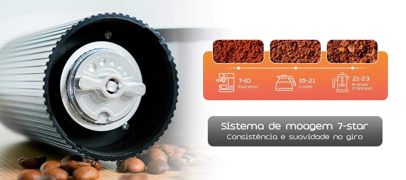 Seu mecanismo de ajuste com mais de 70 cliques de moagem garante controle milimétrico, atendendo desde o espresso encorpado até o coado equilibrado e a prensa francesa com extração limpa.