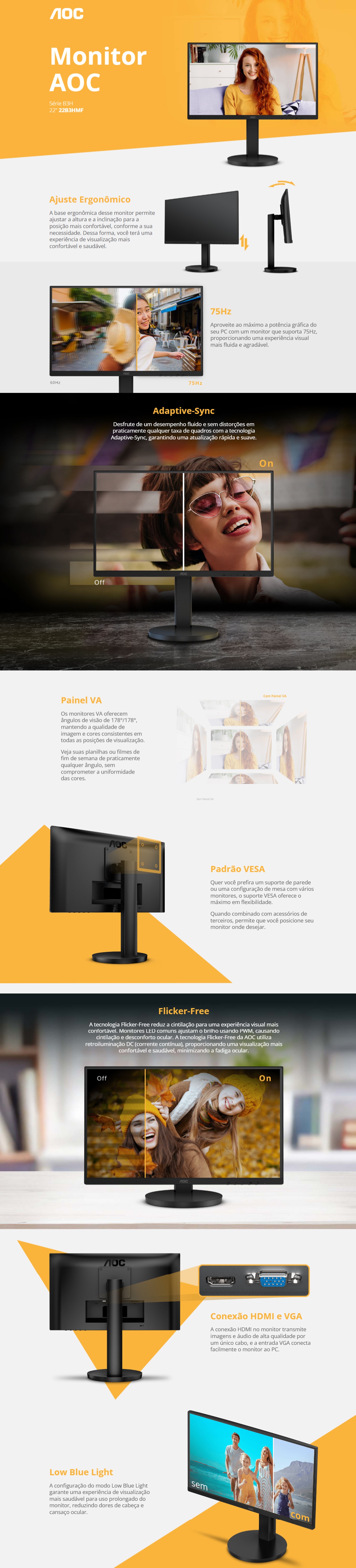 Monitor AOC, 22 Pol, Full HD, 75Hz, VA, HDMI/VGA, Adaptive-Sync, 22B3HMF