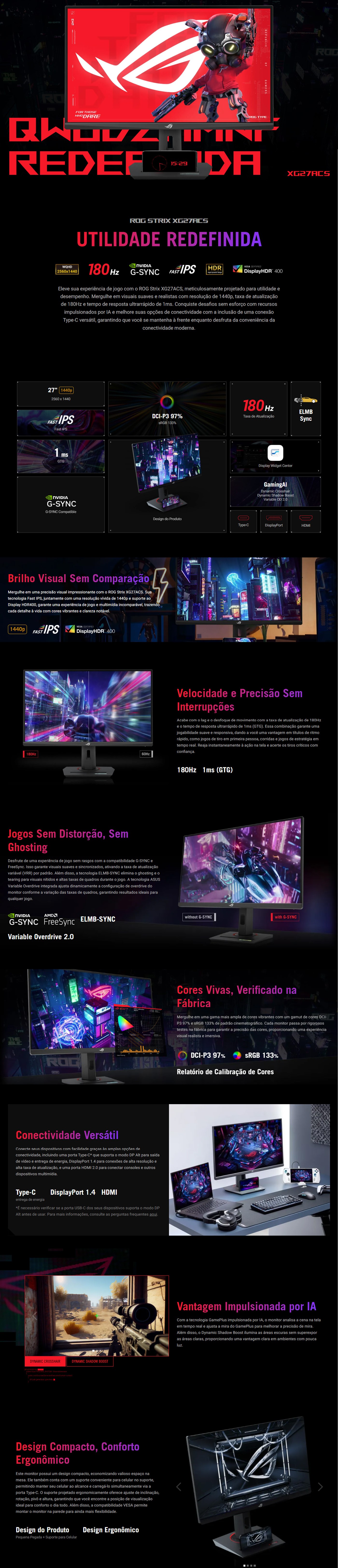 Monitor Gamer Asus ROG Strix XG27ACS, 27 Pol, WQHD, Fast IPS, 180Hz, 1ms, 133% sRGB, G-Sync Comp, FreeSync, HDMI/DP/USB-C, 90LM09Q0-B011X1