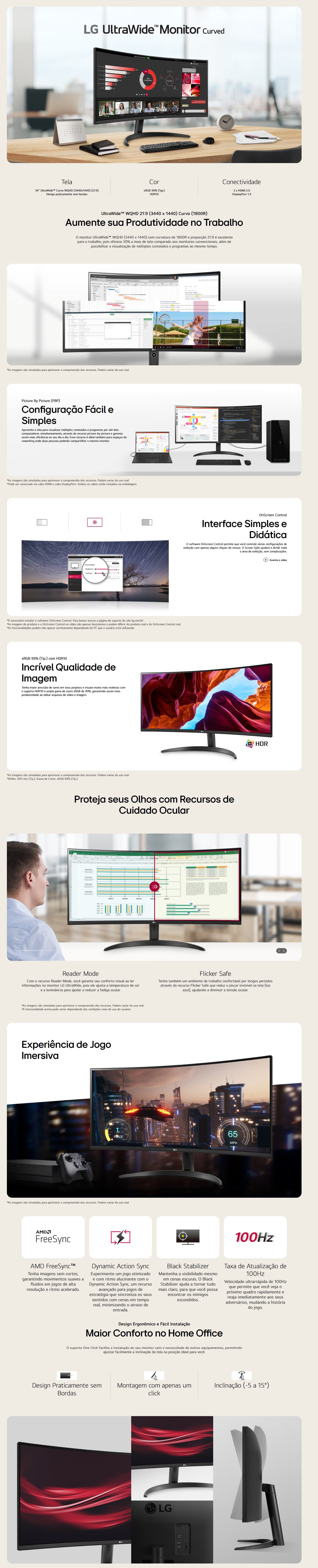 Monitor Gamer LG 34 Pol, Curvo, UltraWide, VA, WQHD, 100Hz, 5Ms, sRGB 99%, HDR10, FreeSync, Preto, 34WR50QC-B.AWZM