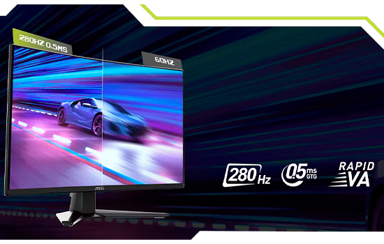 Conta com uma taxa de atualização de 280Hz e tempo de resposta de 0,5ms (GtG, Mín.). Uma enorme vantagem em jogos de ritmo acelerado, como jogos de tiro em primeira pessoa, jogos de luta, simuladores de corrida, estratégia em tempo real e esportes.