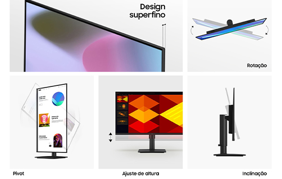 O design super fino adiciona estilo a qualquer ambiente, junto de uma tela com ajuste de altura para oferecer o melhor ângulo e mais versatilidade. As bordas ultrafinas aproveitam ao máximo o espaço e você pode até girar a tela 90 graus para obter uma visualização vertical.