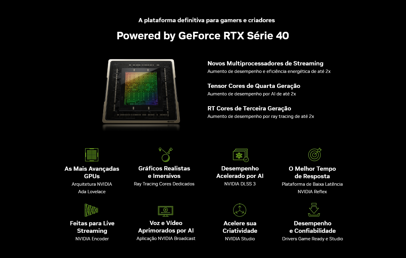 Leve seus projetos criativos a um novo nível com o NVIDIA Studio. Impulsionada por um novo hardware dedicado, a RTX Série 40 oferece um desempenho imcomparável em renderizações 3D, edição de vídeo e design gráfico. Experimente recursos avançados acelerados por RTX nos principais softwares criativos, drivers NVIDIA Studio desenvolvidos para oferecer máxima estabilidade, e um confunto de ferramentas exclusivas que utiliza todo o poder da RTX para fluxos de trabalho criativos otimizados por AI.